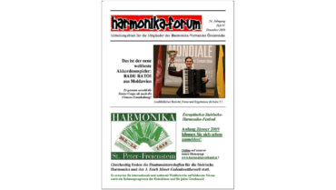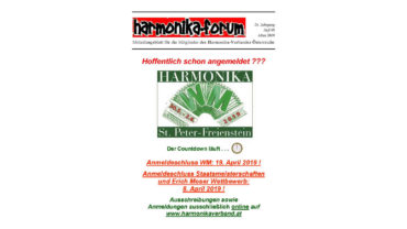 Aus dem Inhalt: Bericht und alle Ergebnisse samt Bildern von der Harmonika-WM und den Staatsmeisterschaften 2019 in St. Peter-Freienstein Insert TAG DER HARMONIKA 2020 in hinterstoder Das war “Akkordeon ist cool” Meisterklasse Akkordeon mit Inaki Alberdi an der MUK Steirischer Harmonika-Award 2019…