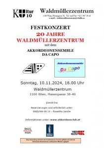 « Alle Veranstaltungen Diese Veranstaltung hat bereits stattgefunden. Ensemble DA CAPO im Waldmüllerzentrum 10. November 2024 ab 16:00 bis 18:00 « Klezmore Festival Wien WIENER BRUT – “Blick nach vorn – an Austrian View” » https://www.akkordeonclub.at/js_events/konzert-des-akkordeonensemble-da-capo-2/ + zu Google Kalender hinzufügen+ Exportiere iCal Details Datum: 10. November 2024 Zeit: 16:00 bis 18:00 Veranstaltungskategorie: Konzerte Veranstaltungsort Waldmüllerzentrum Hasengasse 38 Wien, Wien 100 Österreich + Google Karte
