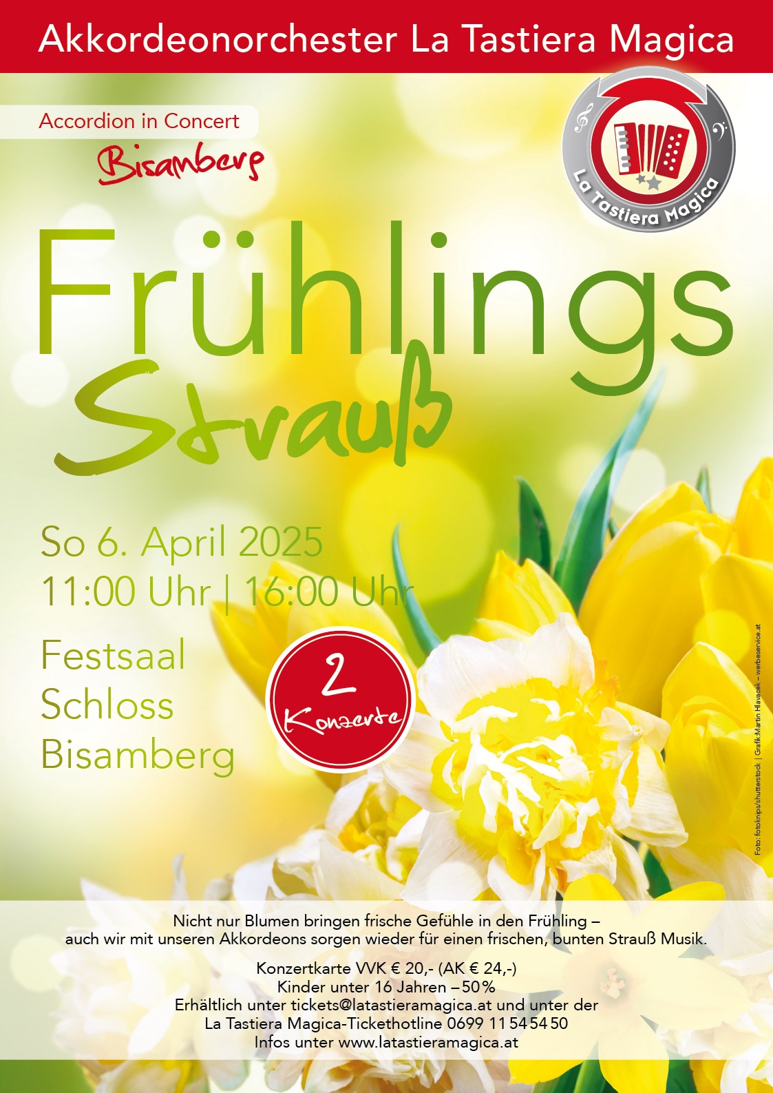 Am 6. April 2025 spielt der Akkordeonverein “La Tastiera Magica” gleich zweimal für Sie das Frühjahrskonzert im Festsaal Bisamberg.