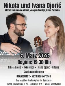 « Alle Veranstaltungen Nikola und Ivana Djoric in Neunkirchen 6. März 2026 ab 19:30 « ViTa MusicA – Eröffnungsgala! 8. Halleiner Akkordeon-Festival » + zu Google Kalender hinzufügen+ Exportiere iCal Details Datum: 6. März 2026 Zeit: 19:30 Veranstaltungskategorie: Konzerte Veranstaltungsort Sparkassen-Lounge Hauptplatz 2 Neunkirchen, Niederösterreich 2620 Österreich + Google Karte