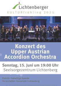 Das Upper Austrian Accordion Orchestra unter der Leitung von Johannes Münzner spielt in der Kirche von Lichtenberg bei Linz ein Konzert. Im diesjährigen Programm spielen Bearbeitungen für Akkordeonorchester eine große Rolle. Es werden Werke u.a. von Richard Strauss, John Williams und Jacob de Haan zu hören sein. Eintritt frei - Spenden erbeten! johannesmuenzner@hotmail.com